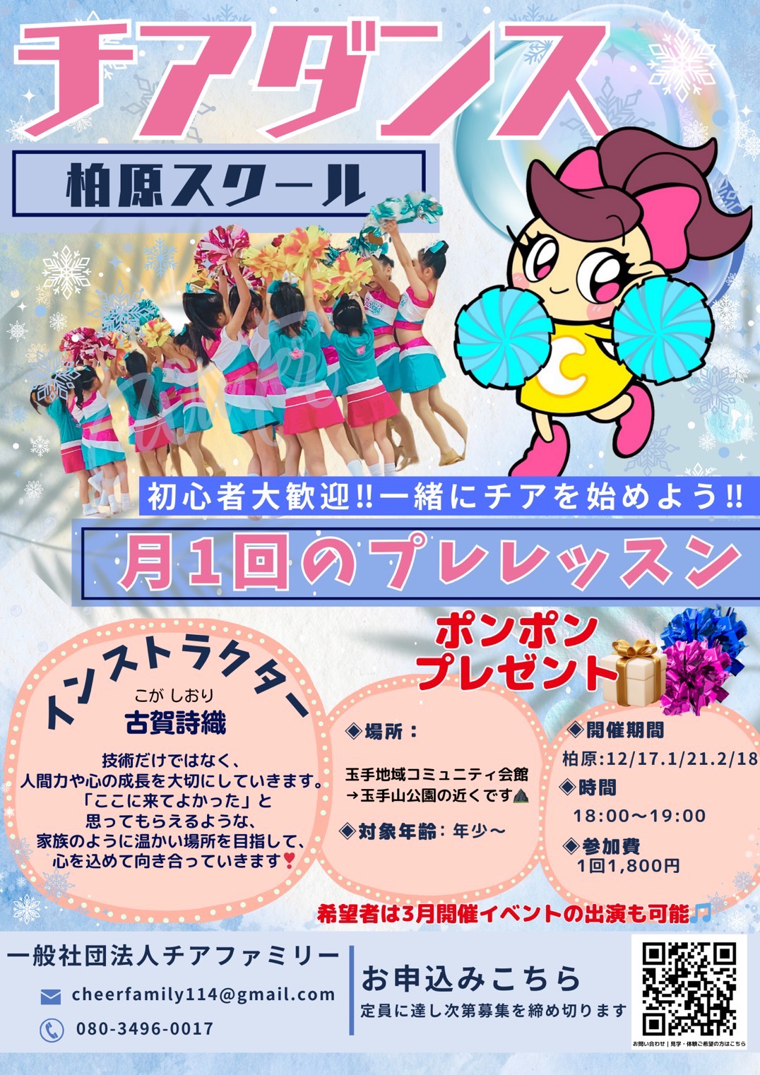 12月、1月、2月水曜日に月1回練習をし、3月14日のチアフェス出演を目指します👏(チアフェス出演は希望者限定です)